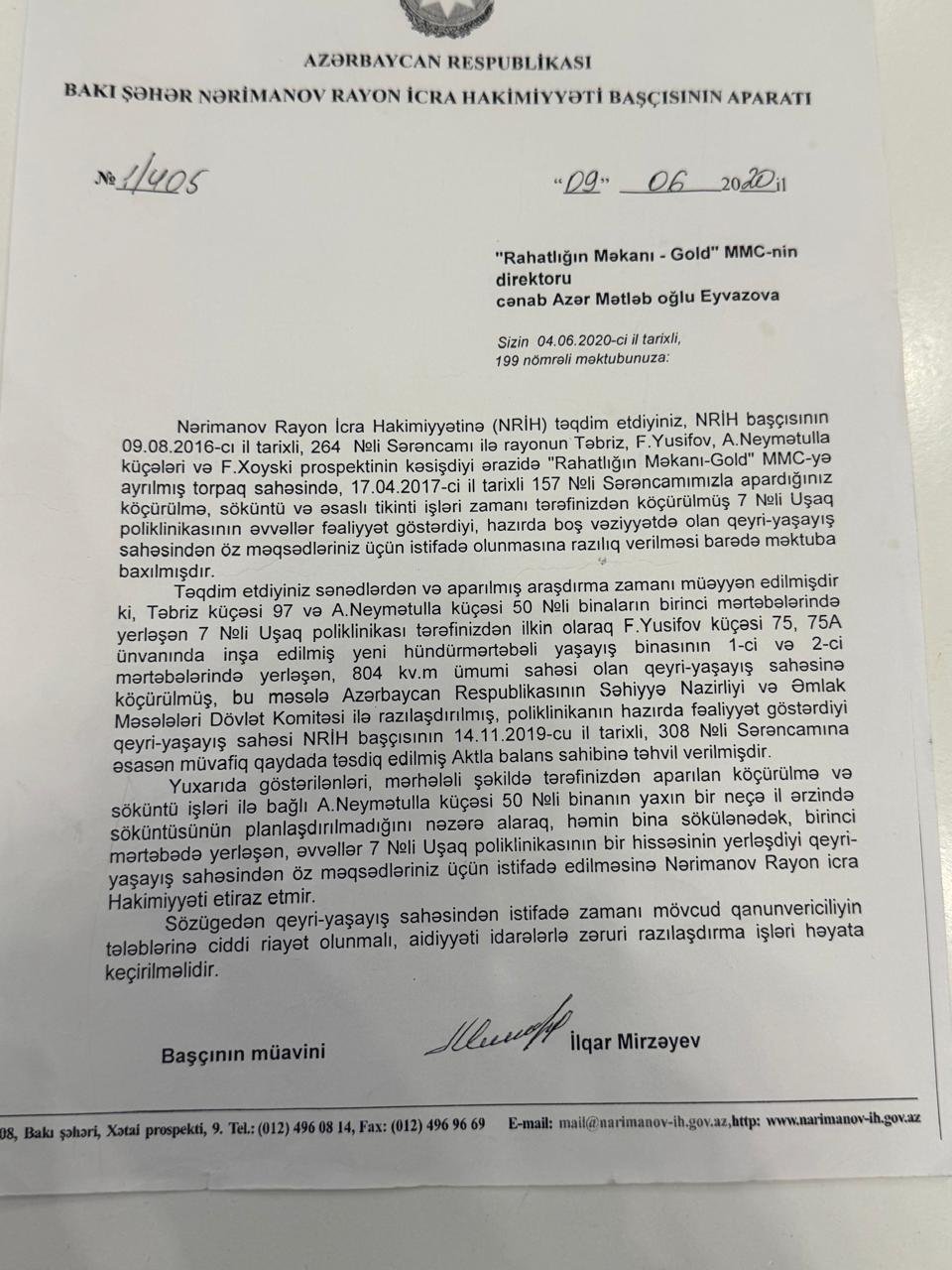 2019-cu ilin noyabrında Nərimanov RİH başçısının №308 saylı sərəncamına əsasən, uşaq poliklinikasının əvvəlki yerində “Rahatlığın Məkanı – Cold” MMC tərəfindən inşa olunmuş binada 804 kv.m ümumi, 746 kv.m istifadə sahəsi olan qeyri-yaşayış obyekti ayrılır. Sənəddə qeyd olunur ki, bu obyekt Nərimanov Rayon Mənzil-Kommunal Təsərrüfat Birliyinin (MKTB) balansına qəbul edilir. Formal olaraq dövlət qurumunun balansında olsa da, faktiki olaraq həmin sahə tikintini həyata keçirən MMC-nin rəhbəri Mahir Mətləb oğlu Eyvazovun nəzarətindədir. Tikilidəki mənzillərin çoxunun ƏDV-si və satış sənədləri Mahir Eyvazovun yaxınlarının adına rəsmiləşdirilib. 2020-ci ilin iyununda RİH aparat rəhbəri İlqar Mirzəyev “Rahatlığın Məkanı - Cold” MMC-nin direktoru Azər Eyvazova rəsmi məktub göndərərək xəbərdarlıq edir ki, obyekt MKTB-nin balansındadır və şirkətin bu ərazidən istifadəsi yalnız qanunvericiliyə uyğun şəkildə mümkündür. Başqa sözlə, icra hakimiyyəti dövlət əmlakından icazəsiz istifadəni “yolverilməz” sayır.