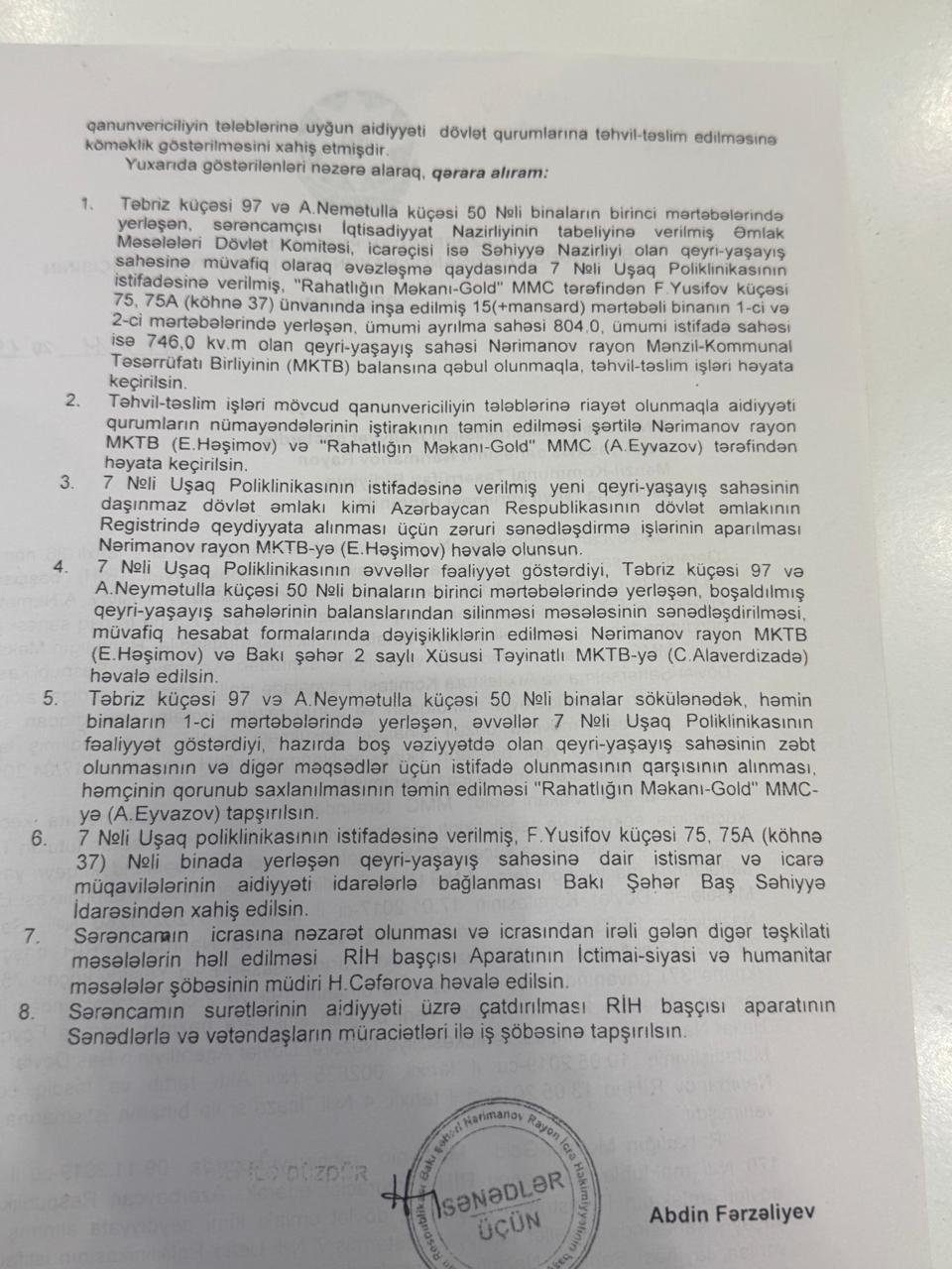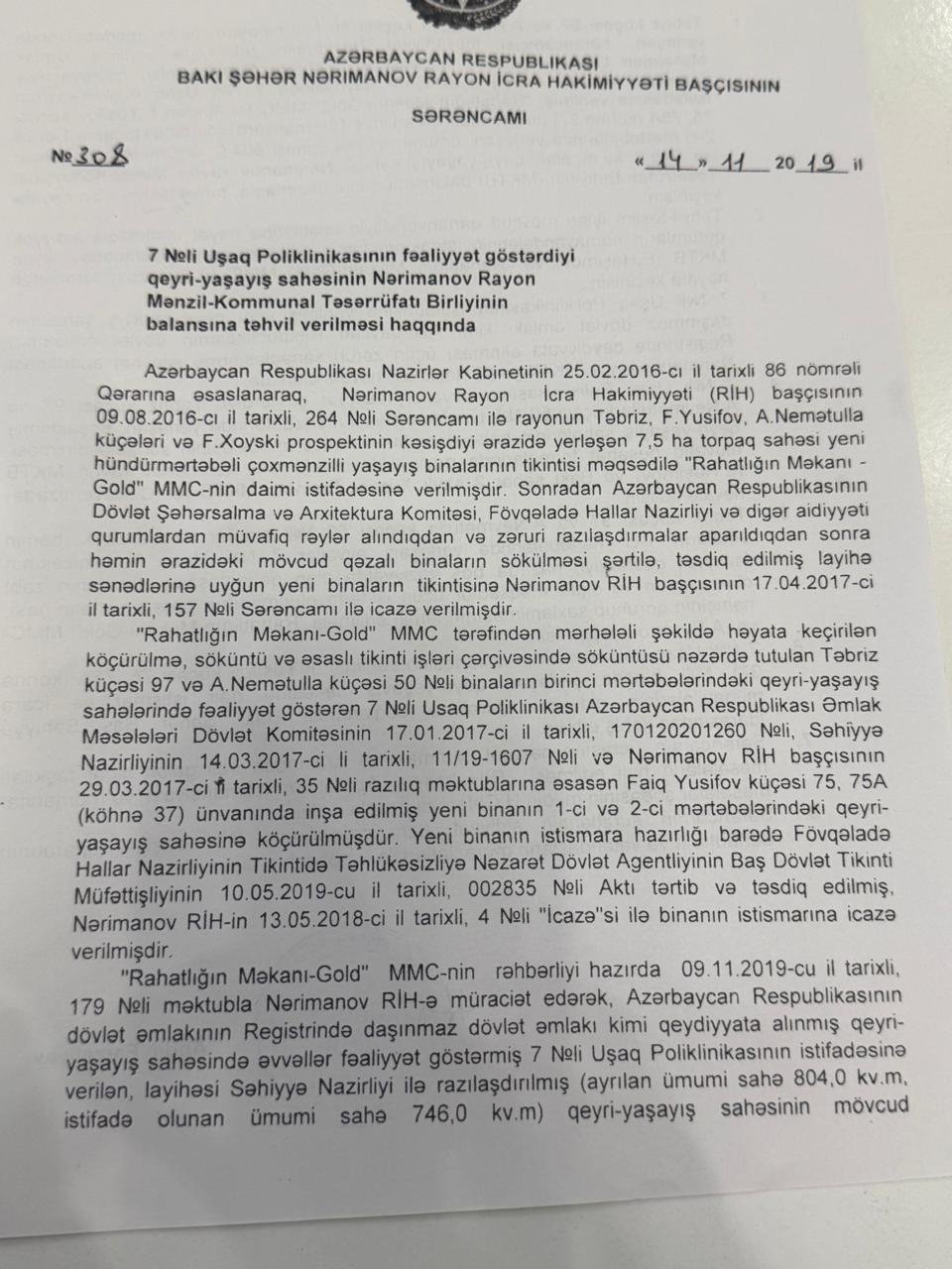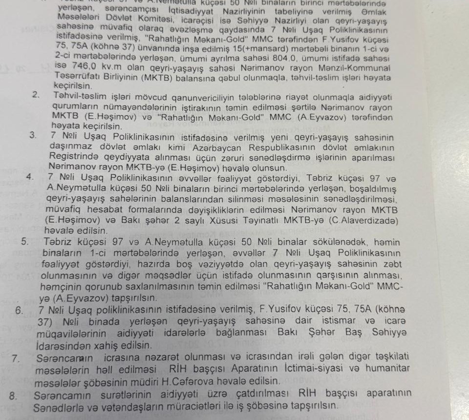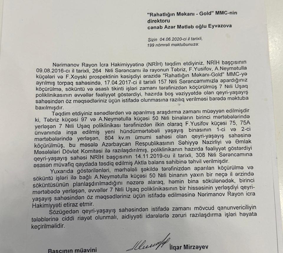 Nərimanov rayonunda dövlət əmlakının, konkret desək, 7 nömrəli Uşaq Poliklinikasının illərlə fəaliyyət göstərdiyi binanın taleyi ətrafında maraqlı sənədlər üzə çıxıb. Bu sənədlərdən aydın olur ki, dövlət tibb müəssisəsinin fəaliyyəti üçün nəzərdə tutulan ərazi sonradan tikinti şirkətinin nəzarətinə keçib, amma formal olaraq başqa bir qurumun balansına verilib. Hər şey 2016-cı ilin avqustunda Nərimanov Rayon İcra Hakimiyyətinin (RİH) 264 nömrəli sərəncamı ilə başlayır. Həmin sərəncamla Təbriz, Ağa Nemətulla və Fətəli Xan Xoyski prospektlərinin kəsişdiyi 7,5 hektarlıq torpaq sahəsi “Rahatlığın Məkanı – Cold” MMC-yə ayrılır. Şirkət burada çoxmərtəbəli binalar inşa etmək üçün torpaq alır. Ərazidə 9 bloklu, 16 mərtəbəli bina tikilir. Lakin yeni kompleksin yalnız bir parkinq giriş-çıxışı var. Bu, ətrafdakı köhnə beşmərtəbəli binaların da giriş-çıxış imkanlarını məhdudlaşdırıb. Üstəlik, 16 mərtəbəli yaşayış binasının həyətinə girişdə şlaqbaum qoyulub. Nəticədə 7 nömrəli Uşaq Poliklinikasına gələn xəstələr, o cümlədən əlillər avtomobillə həyətə buraxılmır. Onları içəriyə ancaq qucaqda daşımaq mümkündür. Yanğın təhülükəsizliyindən danışmaq isə ümumiyyətlə yersizdir. Vaxtilə həmin sahədə 7 nömrəli Uşaq Poliklinikası fəaliyyət göstərirdi və vətəndaşlar heç bir maneə olmadan poliklinikaya gedə bilirdilər. Tikinti işləri başlayanda bina sökülüb və 2017-ci ildə RİH-in 157 nömrəli sərəncamı ilə müvəqqəti olaraq F.Yusifov küçəsi 75, 75A (köhnə 37) ünvanındakı binaya köçürülüb.